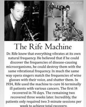 Royal Raymond Rife (American Scientist) developed the RIFE machine in 1920, also known by RIFE frequency generator. That machine produces low energy waves and in 1934 R.R.Rife cured 16 terminal stage cancer patients and today is used to help patients with many other problems.